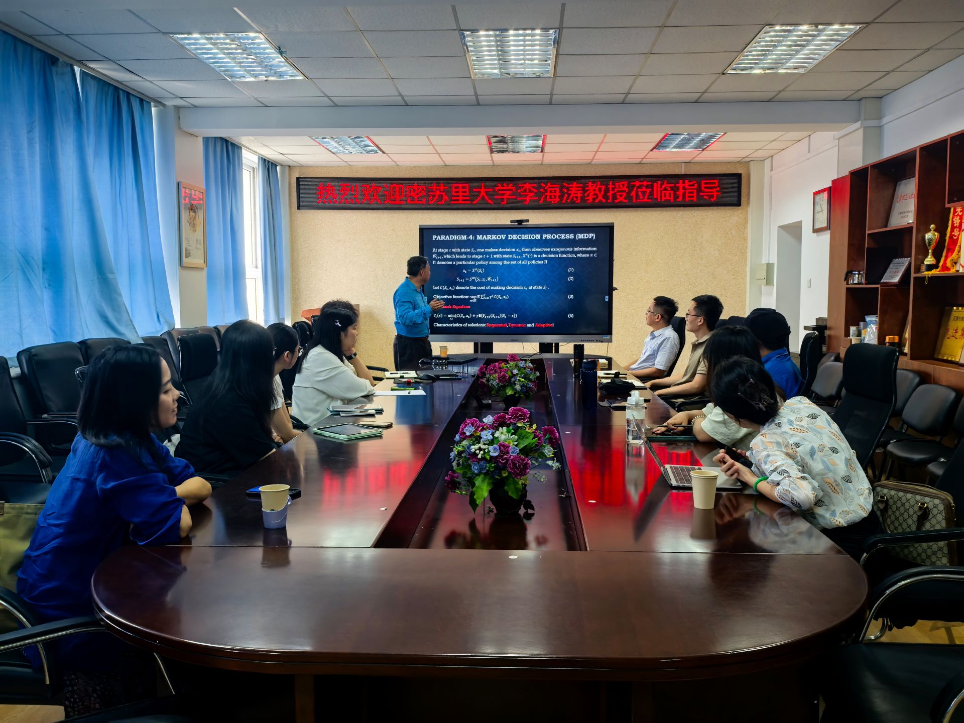 李教授阐述了供应链分析的三大分析方法,并结合生产制造、物流运输、供应链配置、生物医药等应用场景解析了如何利用统计学、运筹学及机器学习等技术赋能生产调度、路径优化和供应链设计等。针对供应链决策挑战,他系统介绍了确定性优化模型、综合仿真优化模型、两阶段随机规划模型、随机动态规划模型等数据驱动优化范式。报告中,李教授强调模型优化、机器学习和人工智能技术的融合应用,指出“分析能力与AI的深度协同”是未来发展的关键。报告结束后,他分享了密苏里大学供应链分析硕士项目的建设经验与人才培养模式。在交流环节,李教授与现场师生就政策不确定性、农业供应链与保险、供应链韧性测度及教育合作可能性等问题进行了深入交流,现场氛围热烈。