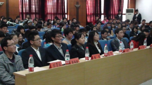 会议伊始,商学院团委副书记张莹为与会学生做了动员讲话,鼓励同学积极投入到“挑战杯”和 Mobile Market 创业大赛。商学院原学生会主席、自组“天之骄子”文化传媒公司的丁琳同学结合自身创业经历,对本次挑战杯创业计划竞赛具体操作流程和注意事项做了讲解;在第十二届“挑战杯”全国大学生课外学术科技作品竞赛中获得全国三等奖的刘家瑞、纪彤两位同学结合自身参赛经历,讲述了参赛心得,详细讲解了 Mobile Market 创业大赛的具体参赛方式及参赛技巧。随后,王庆副院长结合指导挑战杯创业计划大赛以及相关学生科技活动的经验,针对到场学生提出的相关问题进行答疑解惑。王院长精彩睿智的解答,鞭辟入里的讲述,赢得与会学生阵阵掌声。