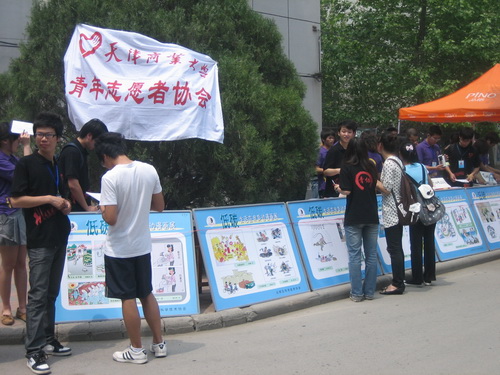 在签字仪式低碳生活环保宣传的现场,学生志愿者向过往的师生
