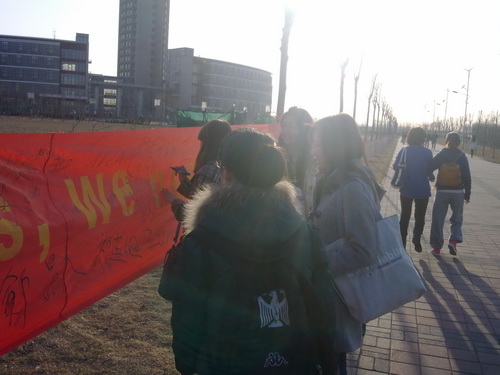 在值班过程中,各位学生干部尽职尽责,各位同学也积极配合,踩踏草坪的现象大大减少。而本次活动的点睛之笔要数横幅签名活动。“少一串脚印,多一片绿色。 Love Our Campus, We Need You! ”的金黄色字样闪耀在长达十五米的红色横幅上,映着夕阳温暖的光芒,寄托了外院人的爱校之情。走过的人们纷纷驻足,用笔将他们的名字与祝福签下。这其中还包括的日语系外教兴津正信,以及韩国和泰国的留学生。简简单单的笔画和文字,不仅代表了个人,更代表了大家对学校的关护与热爱。