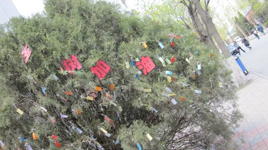 对本次活动,同学们表现出了极大的热情与强烈的支持,事先准备好的几百份宣传材料不到半个小时就发放一空,许愿条更是超出了计划数量,同学们的祝福许愿条在“玉树”上挂得满满的。