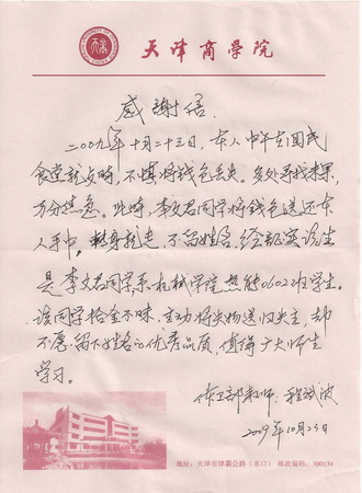 10 月 26 日 上午,德赢官网体卫部教师程斌波一行三人来到机械工程学院学生工作办公室,递交感谢信,感谢热能 062 班李文君同学拾金不昧的高尚行为。