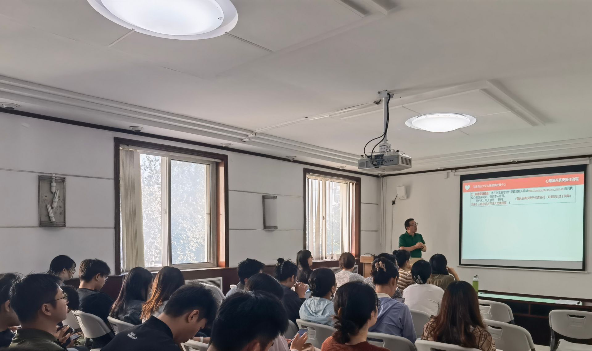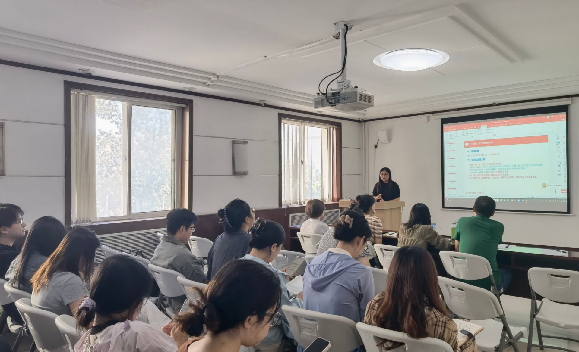 心理测评与访谈培训环节,心理中心专职教师李成国就新生心理测评工作流程开展专业培训,现场演示了心理健康教育大数据平台的操作方法。通过数据化、精准化的管理工具,辅导员可更高效地了解新生心理状态,实现早期预警和动态干预。随后,马怡然老师围绕“学生心理访谈的态度与方法”进行专题培训,结合典型事例,重点讲解了心理访谈中关系建立、信息收集和资源转介等关键环节。心理中心主任杨爽老师进一步就工作伦理与多方协同机制进行强调,对心理访谈中的工作细节进行说明,提升了培训的专业性与系统性。