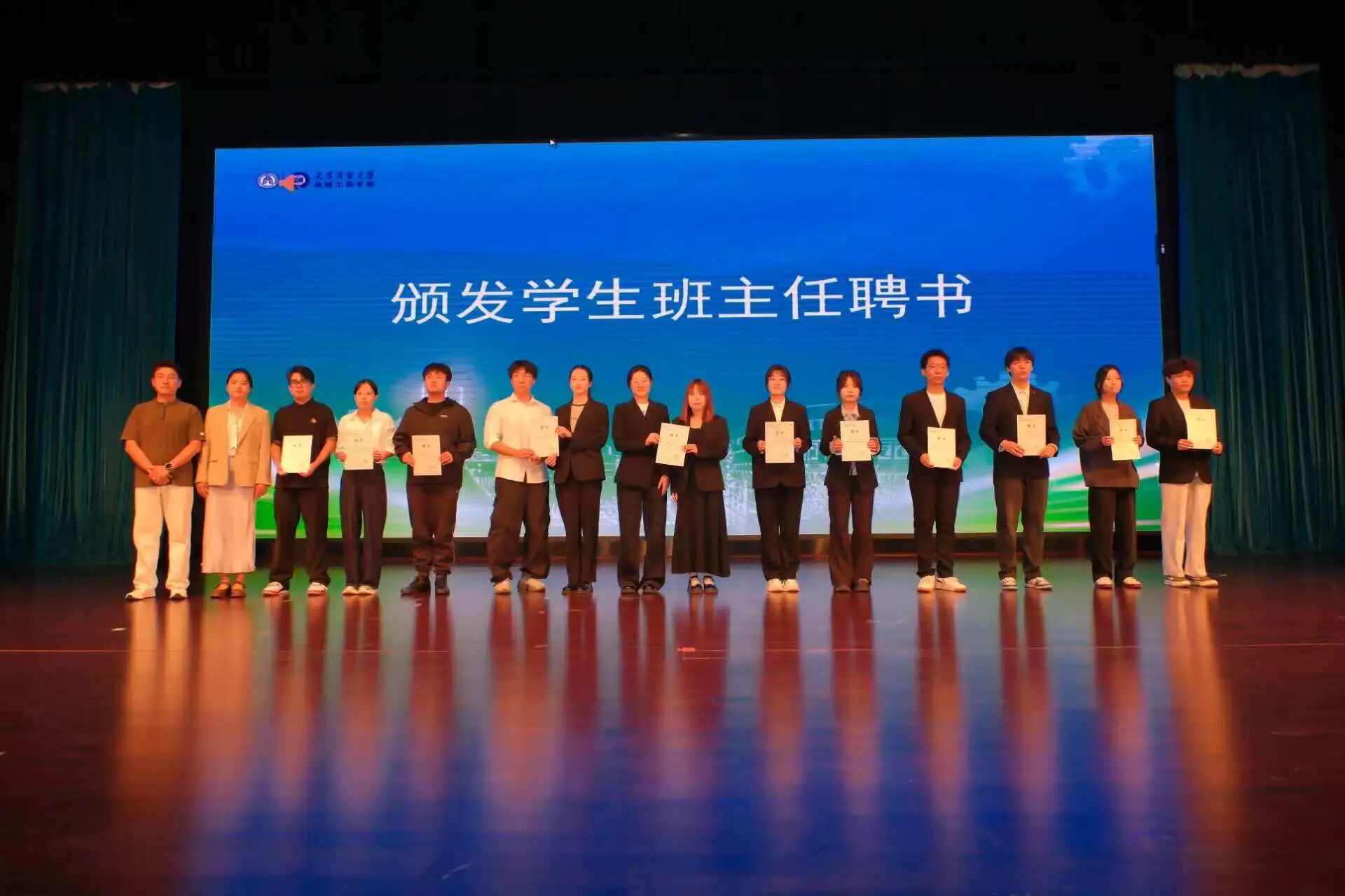 典礼现场,张莹和刘圣春共同为担任班主任超过15年的教师刘斌颁发“孺子牛奖”,陈爱强和新生辅导员分别为新生班主任代表和学生班主任代表颁发聘书。