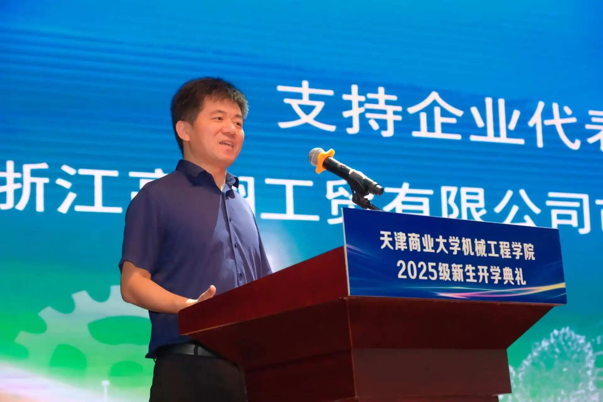 曹丹辉作为支持企业代表发言。他介绍了公司专注制冷设备、服务全球冷链的历程,随后结合行业发展勉励新生珍惜在校时光,夯实专业基础,坚守原则与理念,保持学习力,把课堂知识转化为社会实践,努力在创新中引领行业升级。