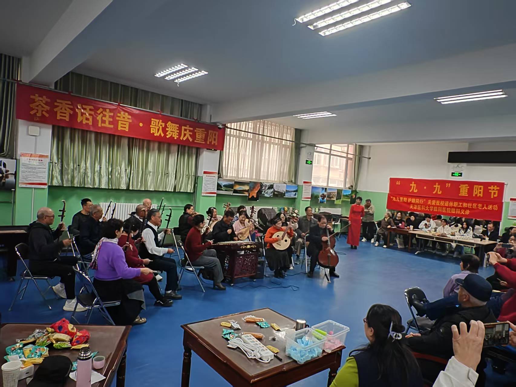 文艺表演以退休民乐协会的民乐合奏《青藏高原》《喜洋洋》开场,展现中华传统音乐魅力并传递节日欢快气息,让老同志沉浸其中;随后四位学生代表带来诗朗诵《致我们敬爱的老师》,用真挚语言表达对离退休教师的敬意,彰显“老少同心、薪火相传”氛围;传统戏曲环节,申雅萍、薛宗厚两位老师分别演唱京剧选段,字正腔圆的唱腔与激昂的旋律唤起老同志回忆,赢得阵阵掌声;邢素军老师朗诵《茅屋为秋风所破歌》,以感染人的声音传递家国情怀与人文温度;最后离退休工作处刘双燕老师的二胡独奏《赛马》将现场气氛推向高潮,灵动琴音获老同志称赞,全场掌声经久不息。
