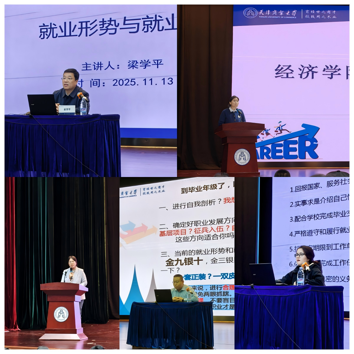 院长梁学平带来“就业形势与就业选择”主题讲座。他运用翔实的数据,从国内外经济社会发展态势切入,深入剖析了当前就业市场的现状与新特点,点出毕业生在求职过程中易陷入的认知误区。梁院长特别鼓励同学们树立“先就业后择业”的理性观念,强调持之以恒、脚踏实地的重要性,为毕业生的职业选择提供了清晰指引。