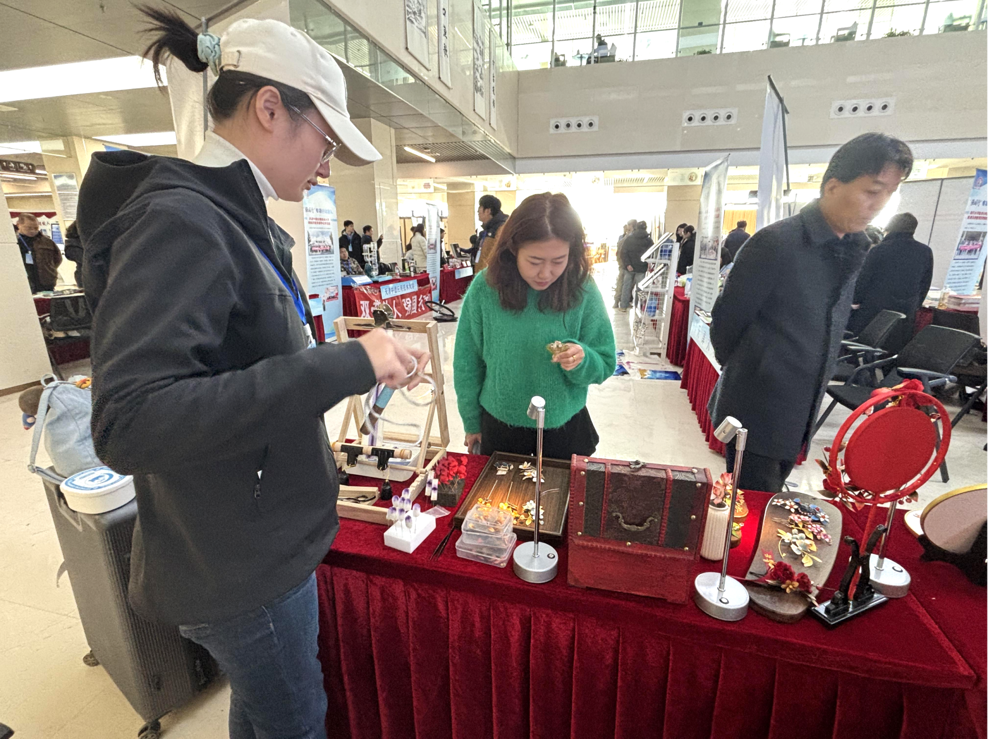 活动中,团队带来的精心创作的非遗花丝镶嵌与掐丝珐琅作品成为全场焦点。花丝镶嵌作品以金、银为原料,采用掐、填、攒、焊、编织、堆垒等传统技法,其精妙绝伦的工艺令现场观众叹为观止并竞相购买;而掐丝珐琅作品则以其绚丽的色彩、浓郁的金属质感与独特的文化符号,吸引了参观者拍照留念与驻足购买。活动现场还设计了体验环节,让观众亲手尝试非遗技巧,在趣味互动中感受非遗魅力,播下文化传承的种子。