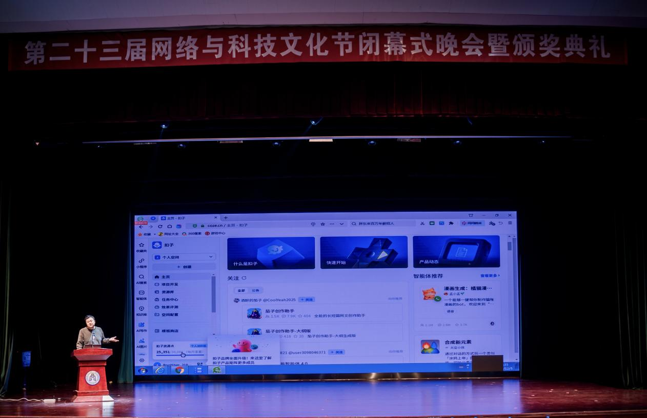 活动尾声,教师代表薛玉岱带来AI智能体的开发与应用的主题展示,通过生动的案例演示和深入浅出的讲解,让学子们直观感受人工智能技术的应用魅力,进一步拓宽了学术视野。在全场师生的热烈掌声中,本届网络与科技文化节圆满落下帷幕。