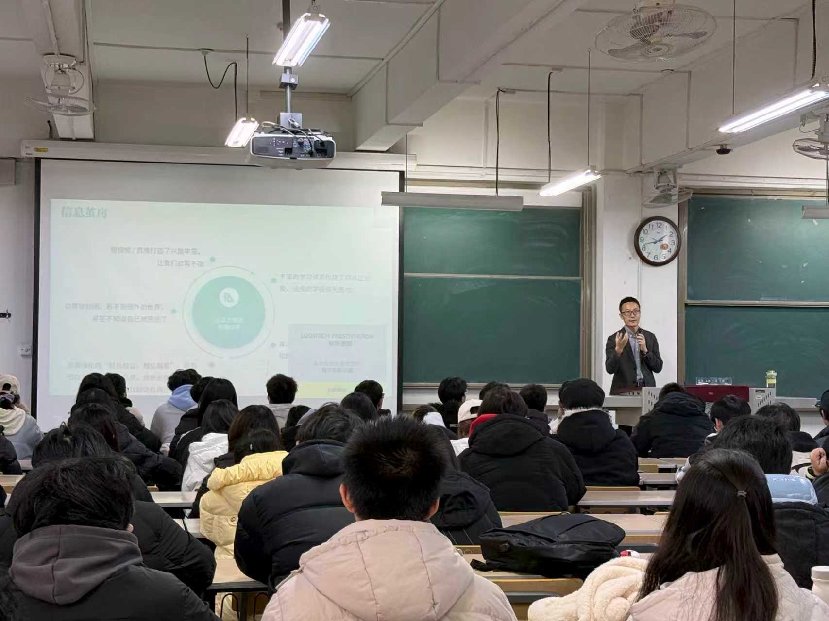 讲座以“成长与发展”为主线,分四大模块展开分享。在理解时代背景模块,池兴禄以“康德的第一个问题——我能认识什么”为切入点,剖析了信息过载、信息茧房、即时满足等时代痛点,引导学生建立对当下环境的清晰认知。在身心健康模块,他针对快节奏时代下的适应性焦虑、认知内耗等问题,列举了久视、作息紊乱引发的健康隐患,并推荐以运动作为科学休息方式,通过案例互动传授情绪调节技巧。在数字素养提升方面,他从信息筛选整合、算法反驯化、隐私保护等维度给出解决方案,重点明确AI工具的使用边界与伦理底线,指导学生通过结构化方法规避数字陷阱、高效利用数字资源。在综合能力锻炼方面,他提出要做好持续与系统化学习,强化沟通协作、逻辑表达、责任心与执行力等核心能力,同时融入项目管理思维,为学生构建起适配数字时代的能力框架。