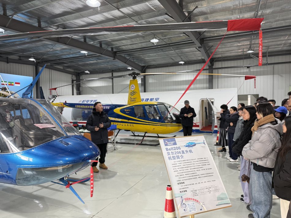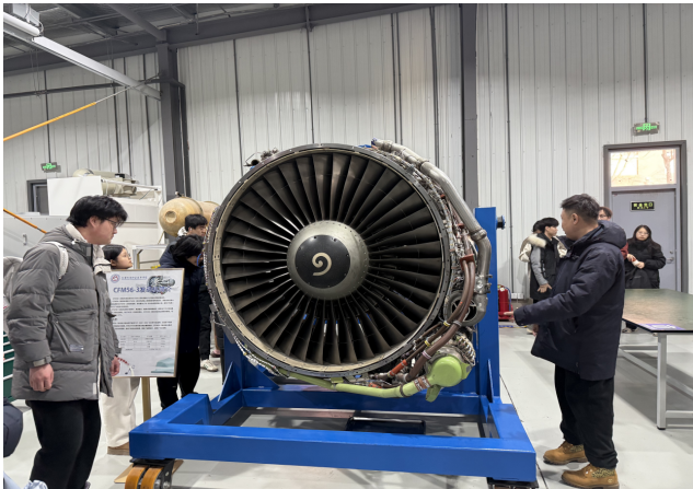研学期间,师生团队走进航空发动机维修厂与通航机库,开启沉浸式学习。在维修车间,大家全程观摩发动机核心部件检测至整机调试的全流程,公司技术专家刘笑麟结合低空飞行安全要求,详细讲解了低空通信技术在发动机状态实时监测、故障预警中的应用逻辑;在通航机库内,多款无人机、通航飞机、直升机整齐陈列,师生们近距离观察机体内通信设备布局、低空导航系统构造,直观感知低空通信技术在物流运输、应急救援等领域的产业应用场景。