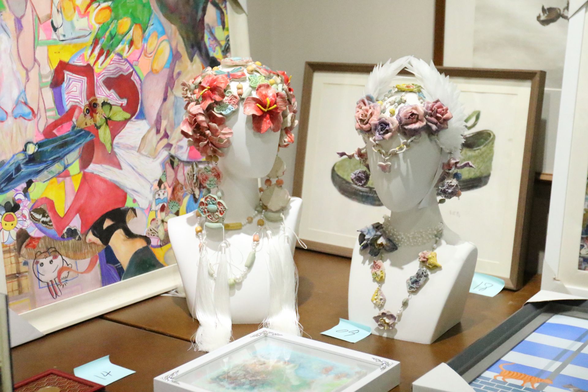 拍卖会现场汇集了来自广告传媒、金融投资、文化教育等多领域的专业人士,大家共同见证了这一商业性实践盛会。拍品构成充分展现了课程的专业深度与学术视野,此次上拍的二十余件作品不仅涵盖中国画、油画、综合材料等传统门类,更有融合非遗技艺与现代审美的创新之作,展现了年轻一代对非遗活态传承的当代诠释。每一件作品不仅是学生专业学习的成果,更承载着他们对“疗愈”主题的个性化思考与情感表达。作品的整体学术水准与完成度获得现场专家的一致好评。