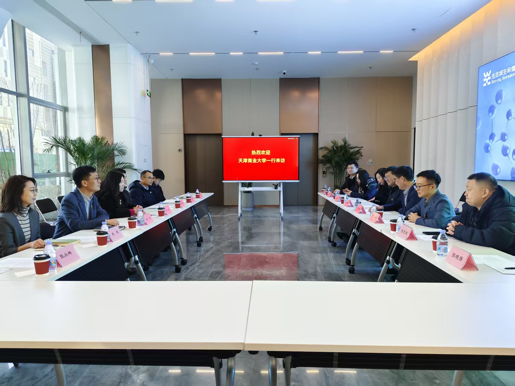 聚焦天津科技创新和产业创新,学院及大健康协同创新研究院党员们首先参观了中新天津生态城开发建设15周年展,在讲解员的带领下,了解生态城在智慧城市建设方面的经验和突出成果。随后,前往生态城生命健康谷,参观生物医药产业园展厅和企业,了解大健康产业创新优势和发展战略定位。最后,与中新天津生态城教体局、天津生态城产业园发展有限公司领导及党员代表开展座谈。座谈方就产教融合、大健康发展前景、语言服务、中外合作办学等方面交换了意见,为今后加强与产业园的合作,开展校企联动打下了基础。