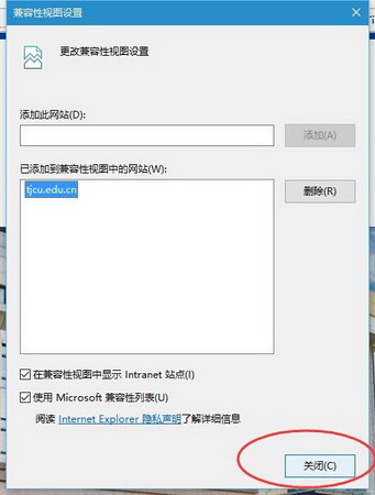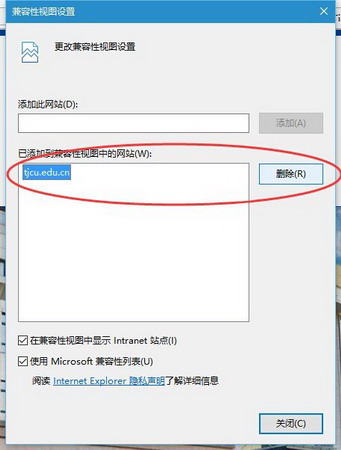 2.在“已添加到兼容性视图中的网站”列表里,将与主页相关的记录选中并点击“删除”键将其删除。