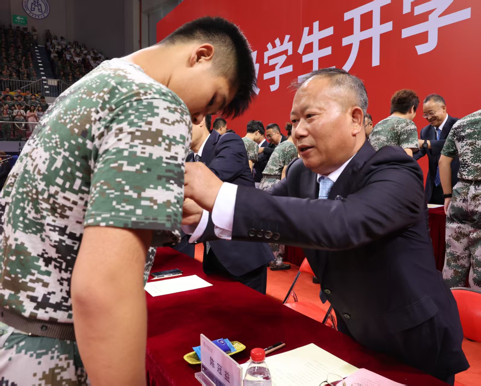 校党委副书记、校长陈冠益为新生佩戴校徽
