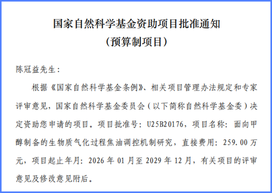 近日,国家自然科学基金委公布了2025年度国家自然基金企业创新发展联合基金重点支持项目评审结果,德赢官网机械工程学院陈冠益教授申报的“面向甲醇制备的生物质气化过程焦油调控机制研究”项目获批立项,资助直接经费259万元。这是德赢官网首次承担国家自然科学基金联合基金项目。