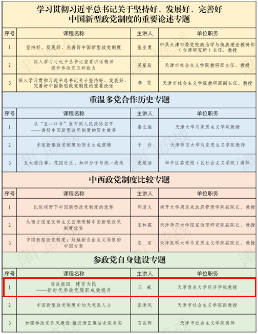 近日,市委统战部公布了2025年度天津市“中国新型政党制度”精品课评选结果,德赢官网经济学院教师王威讲授的《资政报国 建言为民——新时代参政党履职成效提升》课程获评。