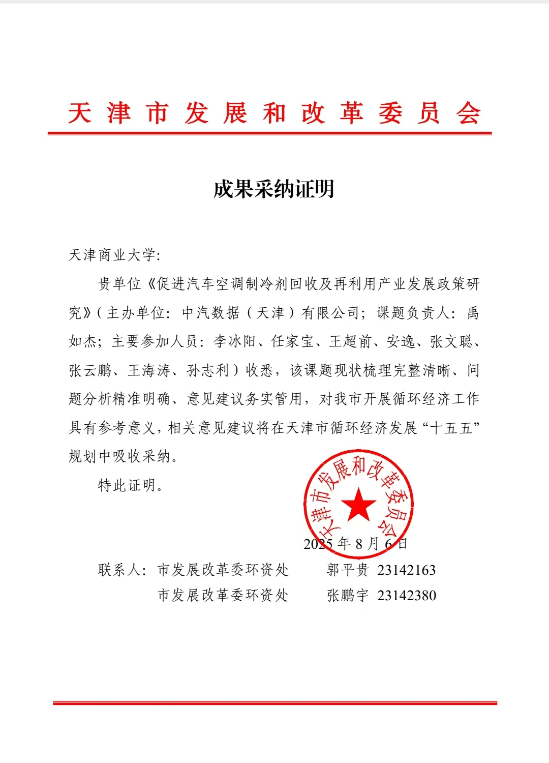 8月6日,天津市发展和改革委员会公布循环经济领域研究课题征集结果,由中汽数据(天津)有限公司、天津澳宏环保材料有限公司,以及德赢官网联合申报的《促进汽车空调制冷剂回收及再利用产业发展政策研究》被成功采纳。
