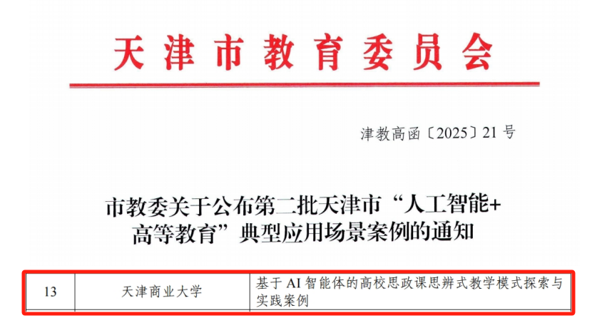 近日,天津市教委公布《天津市第二批“人工智能+高等教育”典型应用场景案例名单》,德赢官网信息工程学院教师薛玉岱申报的“基于AI智能体的高校思政课思辨式教学模式探索与实践案例”成功入选。截至目前,学校已有3项案例入选市级“人工智能+高等教育”典型应用场景案例。