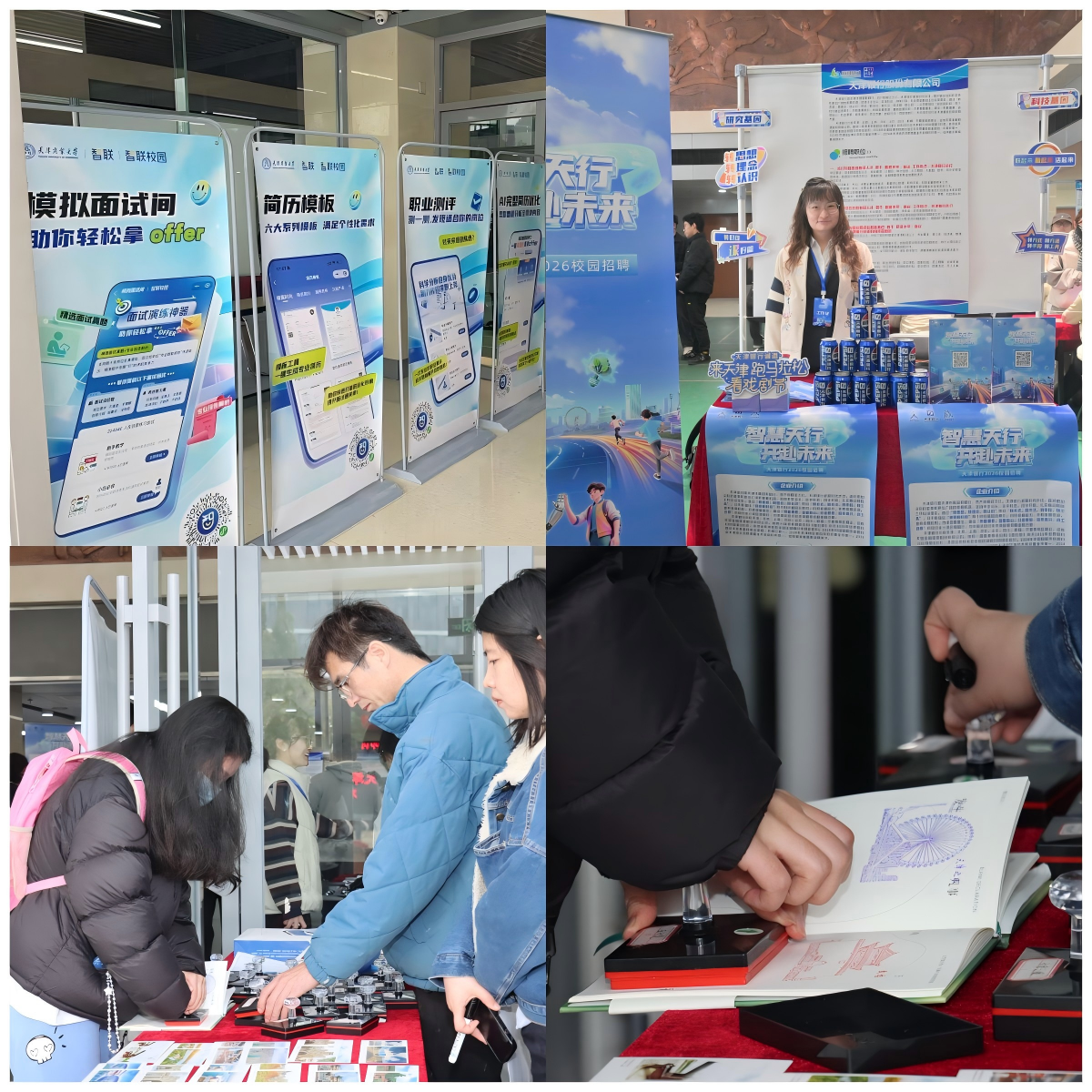 招聘会现场设置“数智赋能就业区”和“天津风景打卡区”。“数智赋能就业区”提供“AI模拟面试间”“AI简历模板”“职业测评”“简历修改”等,学生只需要“扫一扫”即可免费获取相关资源。“天津风景打卡区”提供30余种天津风景明信片和印章,学生可现场领取明信片并加盖自己喜欢的风景印章。