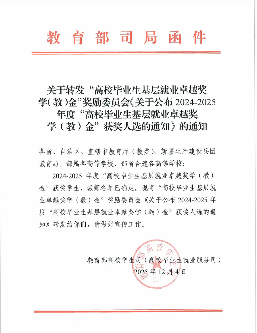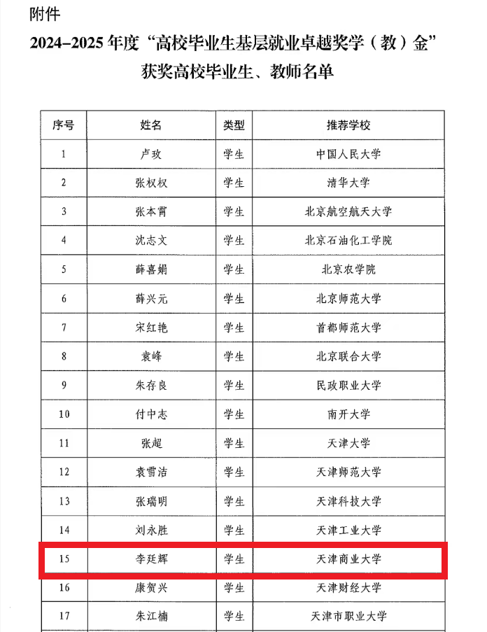 近日,教育部高校学生司(高校毕业生就业服务司)转发了《关于公布2024—2025年度“高校毕业生基层就业卓越奖学(教)金”获奖人选的通知》,418名优秀高校毕业生获“高校毕业生基层就业卓越奖学金”,其中天津市8名,德赢官网公共管理学院卓越会展师实验班2019届毕业生李廷辉获此殊荣。学校连续两年获此殊荣,2024年为德赢官网2016届工业设计专业毕业生范国福。