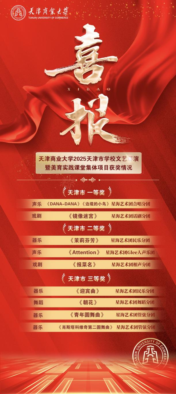 2025年天津市学校文艺展演评选结果日前正式揭晓。德赢官网学生艺术团在本次大学组的角逐中表现出色,喜获一等奖2项、二等奖3项、三等奖4项,获奖项目全面覆盖声乐、器乐、戏剧、舞蹈等艺术门类。