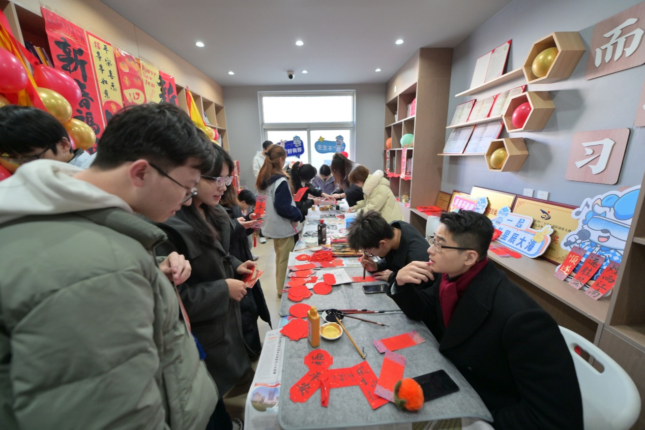 本次游园会精心设置了“传统文化体验”与“创意互动体验”两大板块。“传统文化体验”板块,同学们体验了书法、木板拓印、投壶、剪纸、灯谜等传统文化项目,在实践中触碰历史脉络,沉浸于浓厚的传统文化氛围中。“创意互动”板块,充满了青春的奇思妙想与协作乐趣。轨道运球考验精细操作与耐心,创意扭扭花激发动手热情,太空舱榫卯拼装令人赞叹不已,还有趣味套圈与提供正装拍照的打卡点,也始终排着长队。同学们在互动游戏中,不仅收获了乐趣与成果,更深切体会到了传统文化在当代青春语境下焕发的全新生命力。