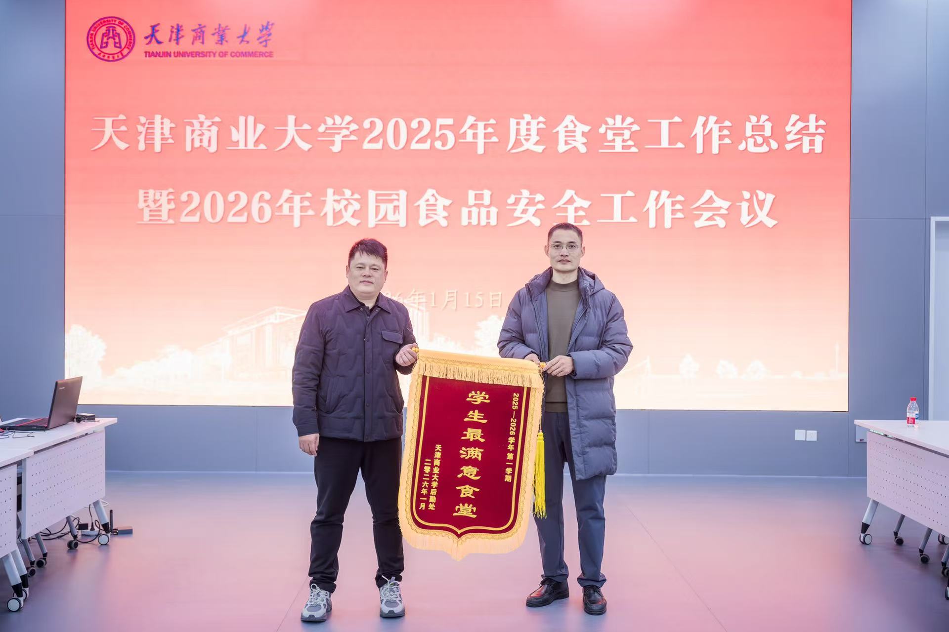 1月15日下午,学校2025年度食堂工作总结暨2026年校园食品安全工作会议在学术会议中心第三报告厅召开。副校长余江,驻校纪检监察组副组长孙郁,北辰区市场监督管理局副局长任志刚、食品安全监管科科长宋天水出席会议。后勤处膳食中心、食材配送中心、监管科管理人员,外包食堂承包企业负责人、项目经理、食品安全员,学生代表等40余人参加。